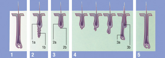 1) Faza wzrostu. 2) Faza zastoju (1a: włosek) (1b: brodawka). 3) Faza odpoczynku (2a: cebulka włosa) (2b: komórki brodawki). 4) Nowa faza wzrostu (3a: nowy włos) (3b: stary włos). 5) Faza wzrostu: nowy włos.